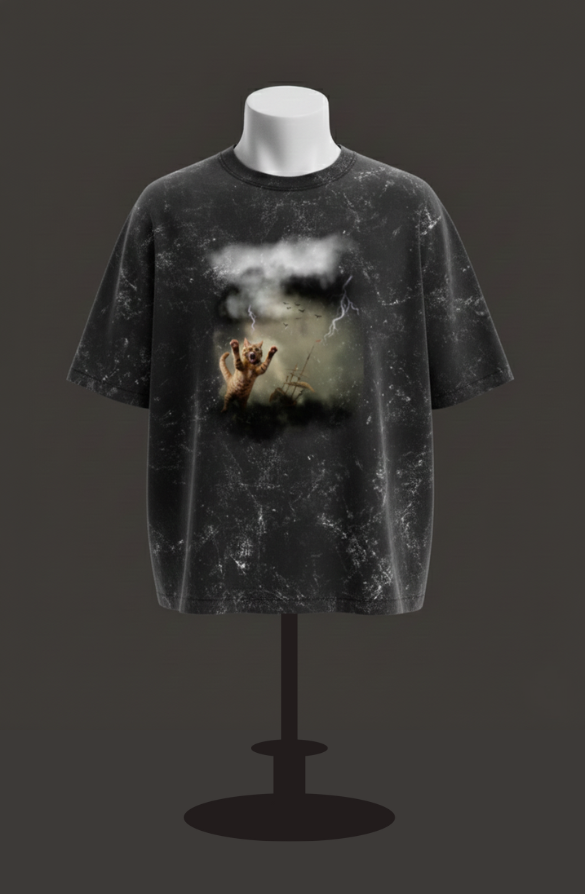 उत्पाद: कैट इन स्टॉर्म यूनिसेक्स एसिड वॉश्ड ओवरसाइज़्ड टी-शर्ट